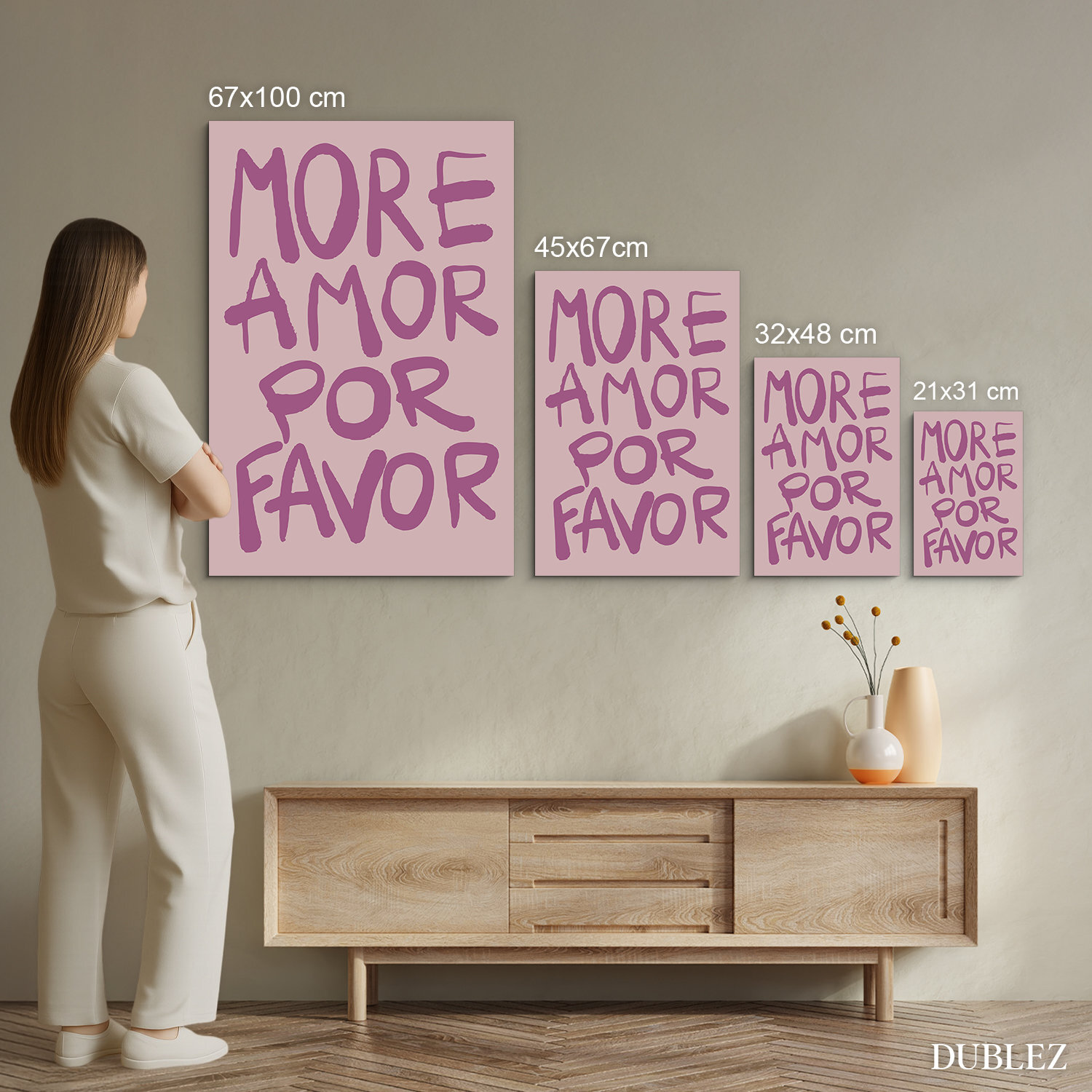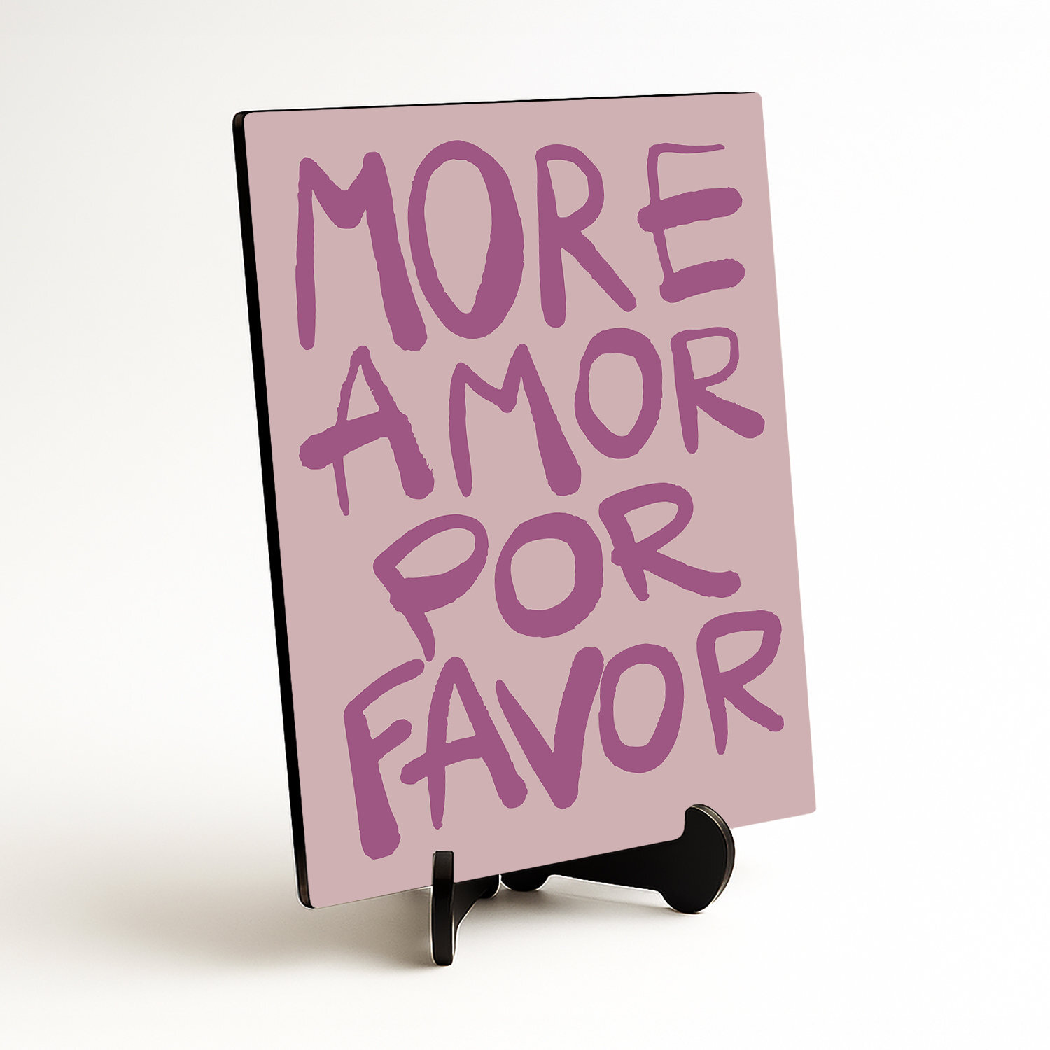 Štýlový obraz na stenu s textom "MORE AMOR POR FAVOR" je krásny a nenápadným doplnkom do interiéru. Jemné ružové pozadie a odvážne typografické písmo vo fialovej farbe sa hodí do obývačky, kancelárie, alebo nad pracovný stôl. Je tiež originálnym darčekom pre ženu, partnerku, manželku alebo kohokoľvek, komu chcete pripomenúť, že svet potrebuje viac lásky. Drevený obraz je ideálny pre všetkých, ktorí milujú moderný dizajn, optimistické odkazy a originálne dekorácie.