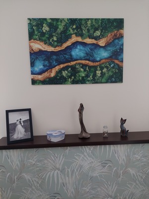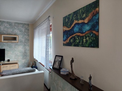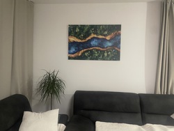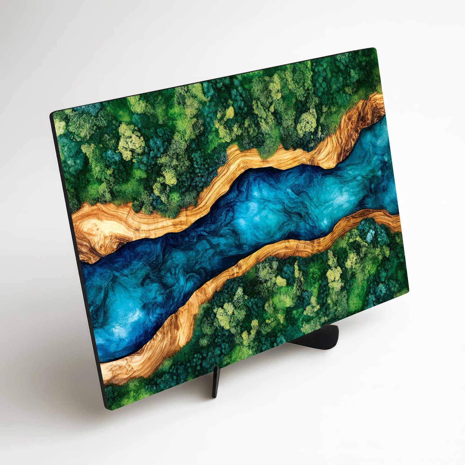 Význam obrazu: Obraz zobrazuje scénu, kde tlačený mach a priezračná modrá rieka z epoxidu evokujú pohľad na prírodu z vtáčej perspektívy. Prináša do interiéru pokoj a harmóniu inšpirovanú krásou prírody.