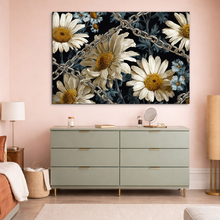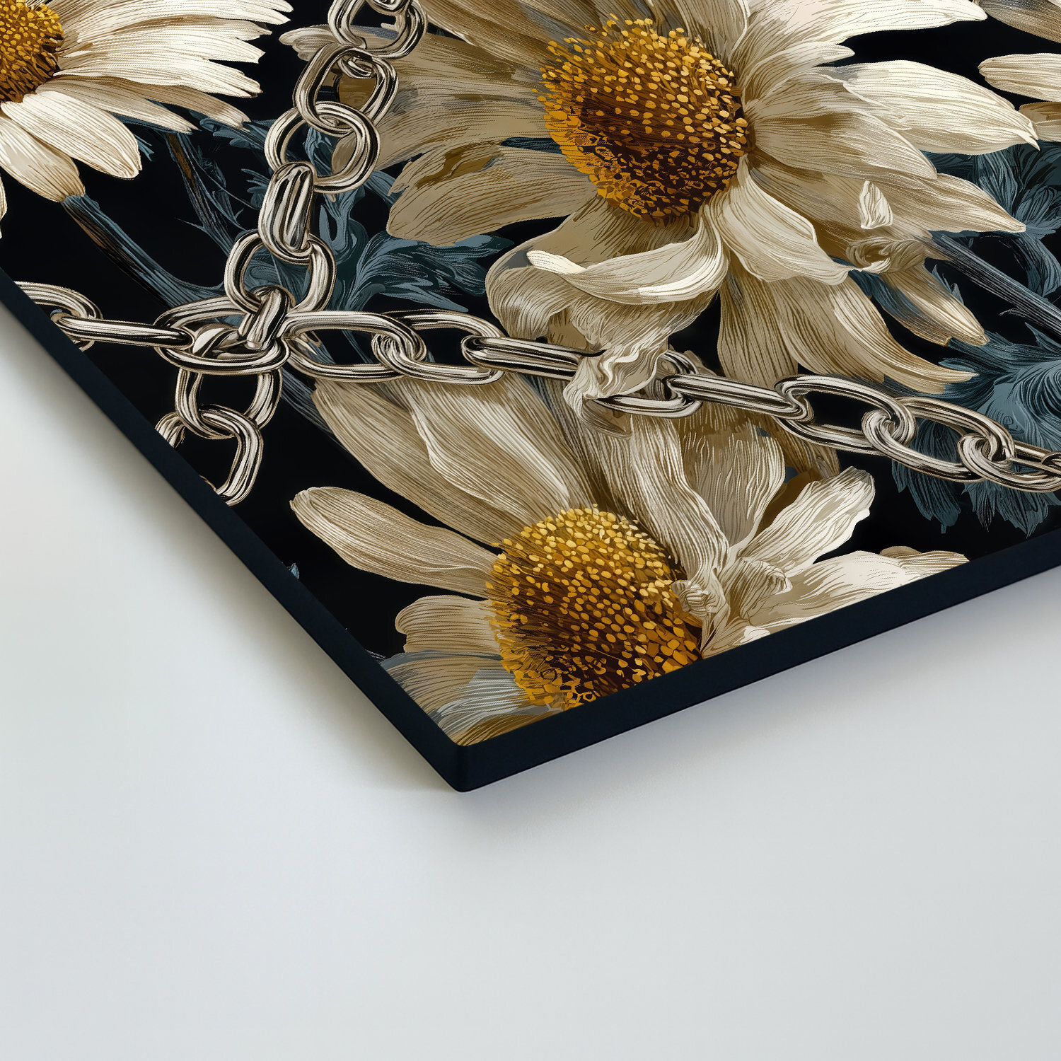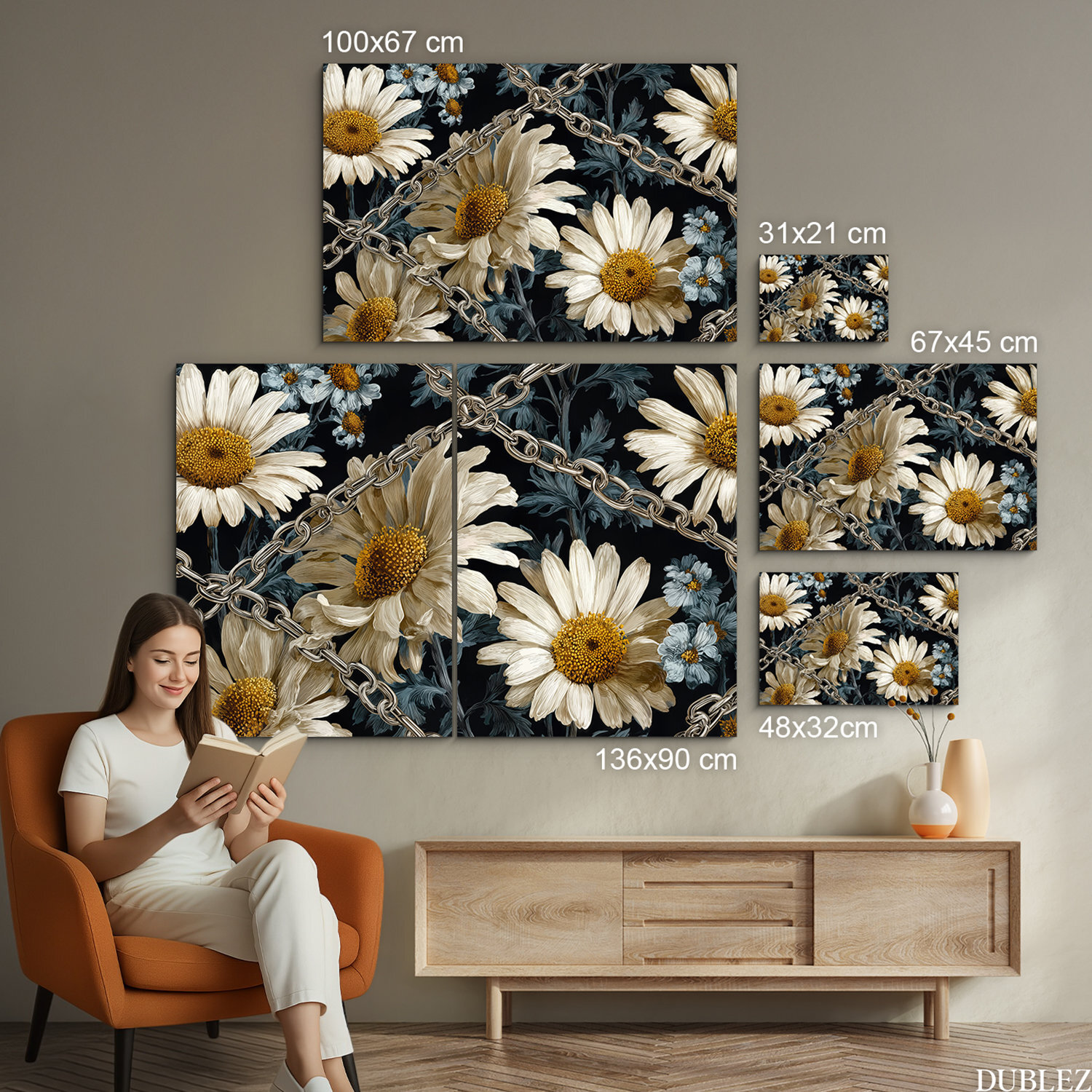 Jednodielny umelecký obraz detailne vykresľuje biele margarétky s masívnymi reťazami. Celá kompozícia na tmavom pozadí vytvára jedinečný štýle Urban Glamour. Drevený obraz sa skvele hodí ako dominantný prvok do modernej obývačky, spálne alebo kancelárie. Spája v sebe prírodnú krásu s industriálnym dizajnom, čo z neho robí nadčasový kúsok pre každý štýlový domov.