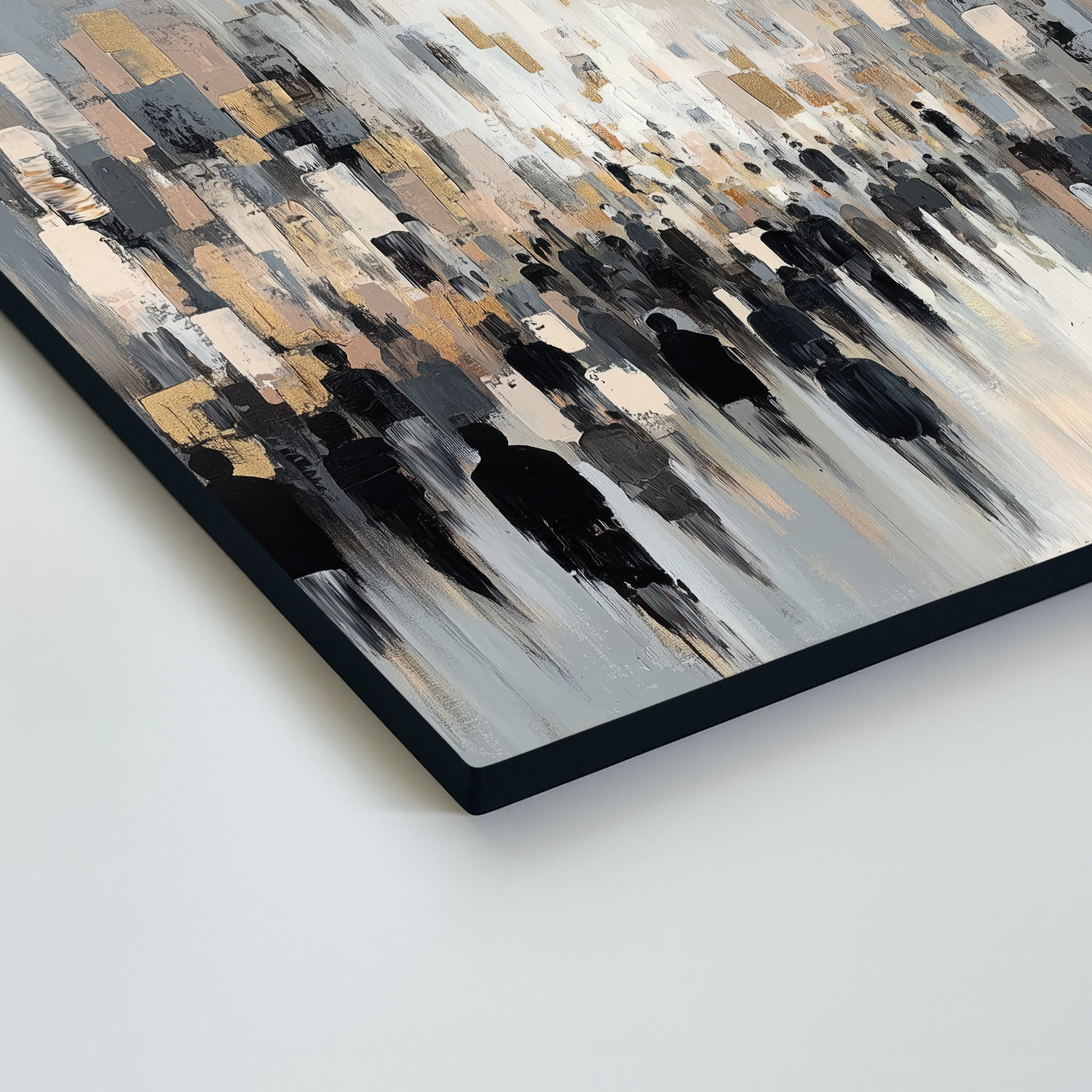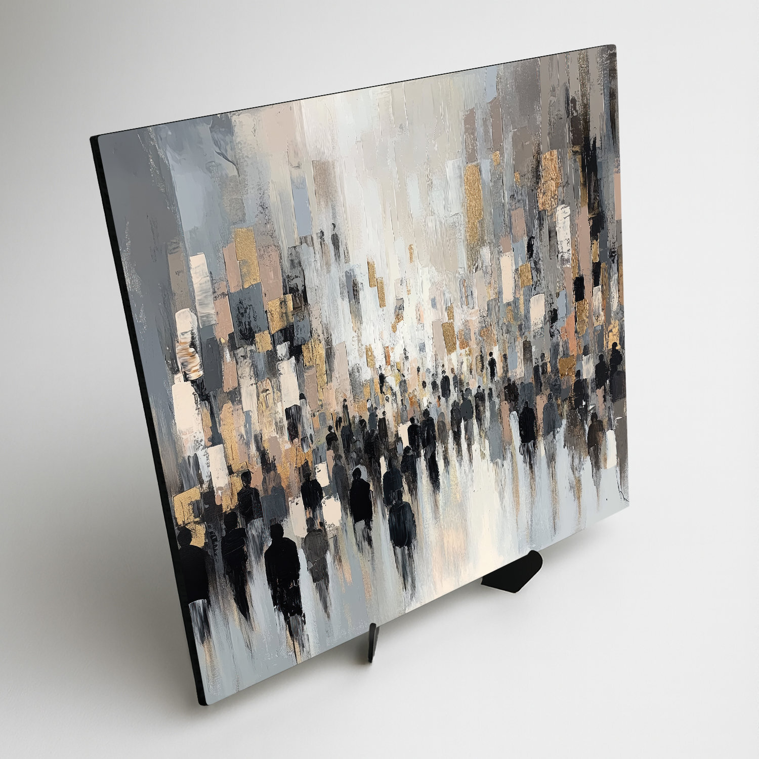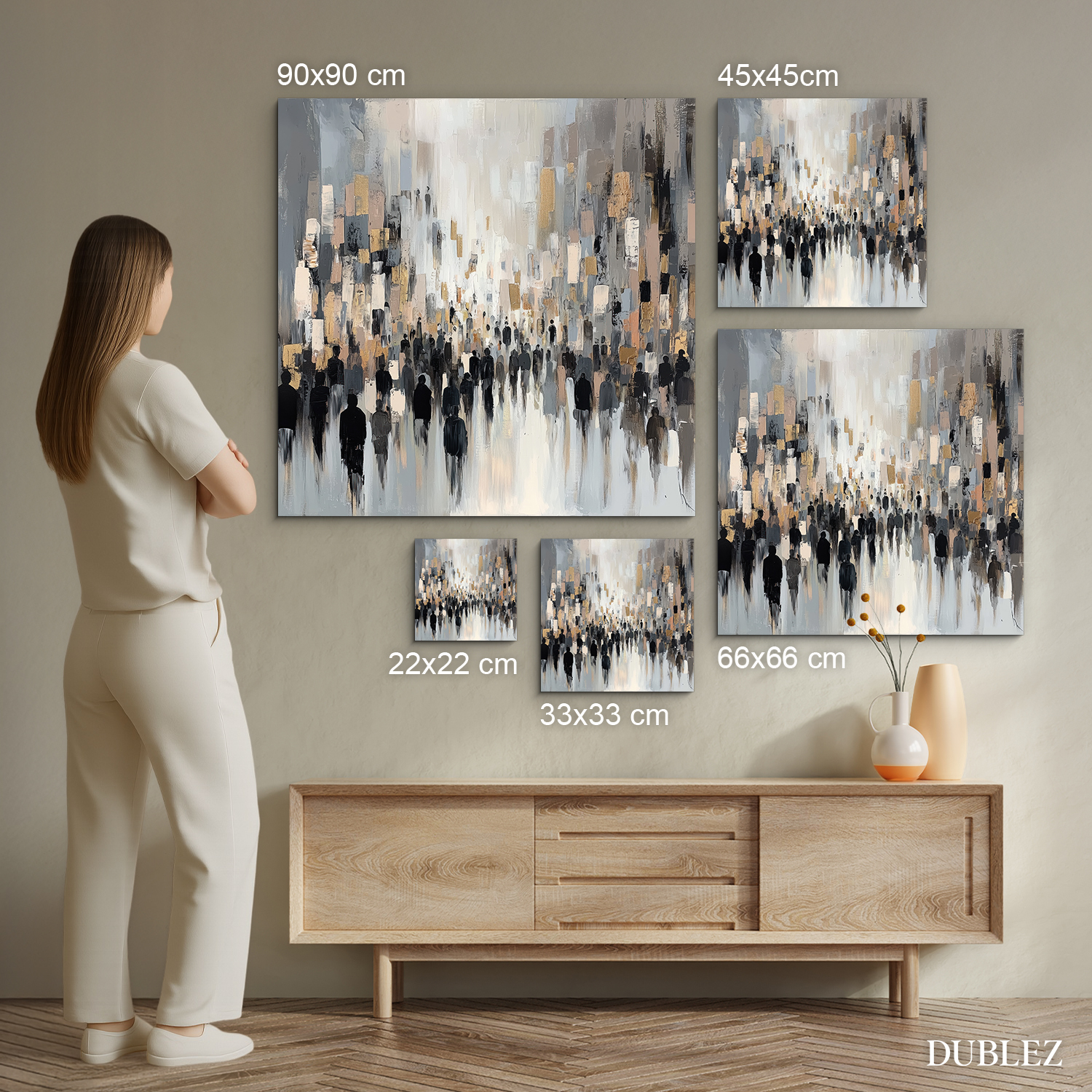 Predstavujeme abstraktný obraz - Ruch mesta, ktorý zachytáva dynamiku mestského života v umeleckej forme. Obraz zachytáva ľudské postavy v rušnom mestskom prostredí, zobrazené prostredníctvom rozmazaných a vrstvených ťahov štetcom. Farebná paleta sa pohybuje od chladných sivých tónov až po teplé odtiene béžovej a zlatistej, čo dodáva kompozícii pocit hĺbky a textúry. Obrazu s nádychom impresionizmu, osloví milovníkov súčasného umenia a štýlu.