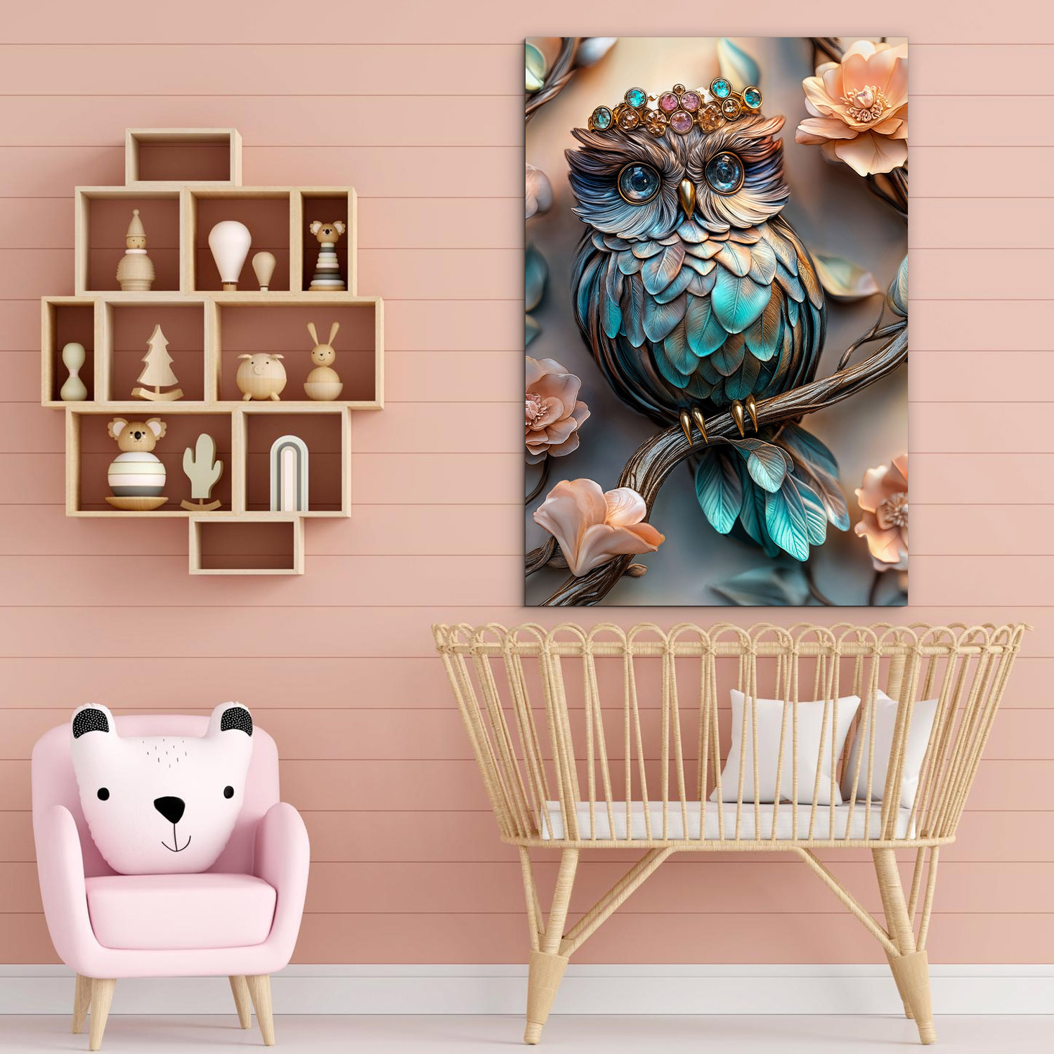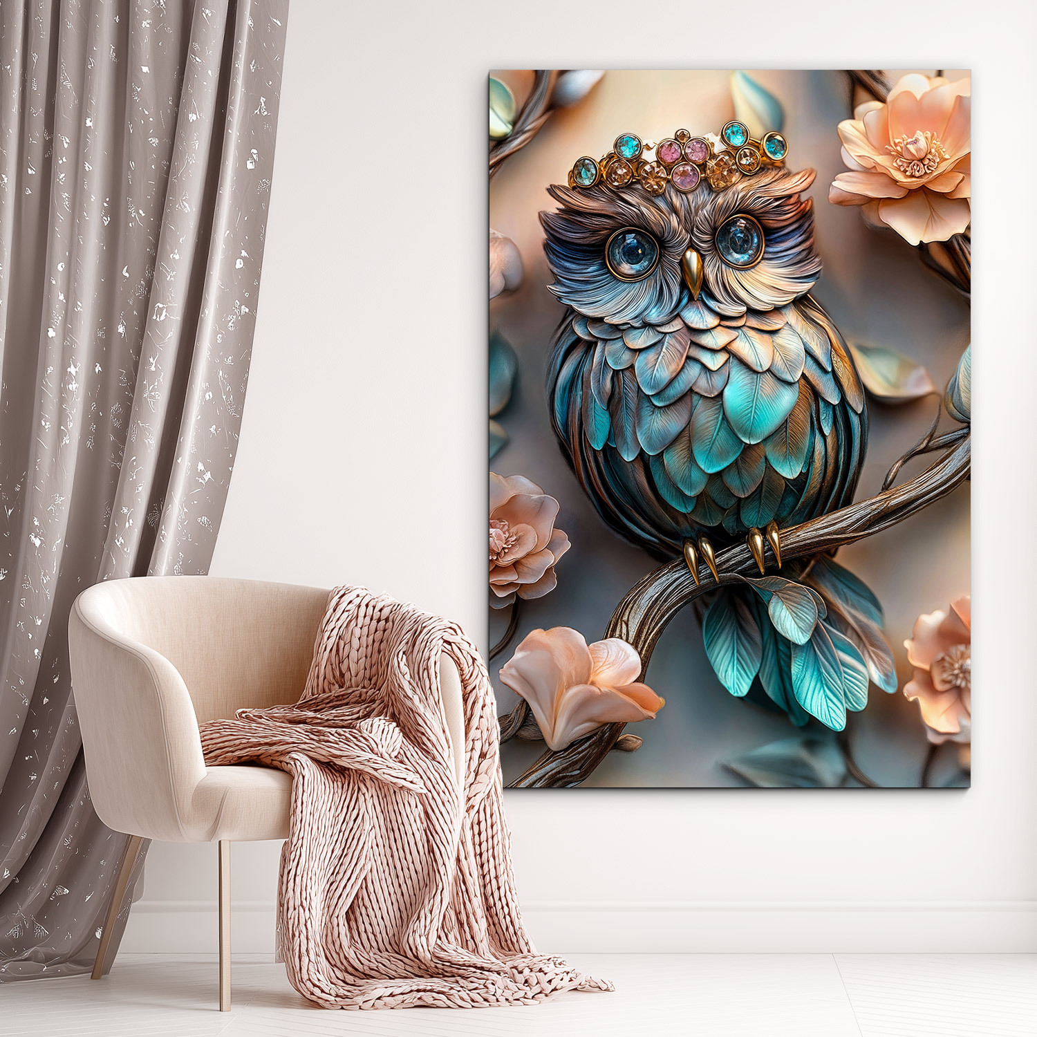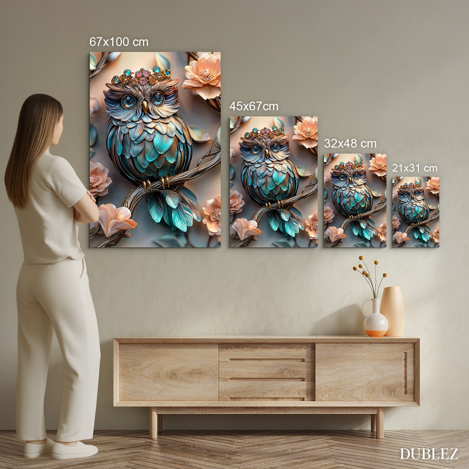 Význam obrazu: Sova s korunkou je symbolom múdrosti, ochrany a jedinečnosti, ktorý do priestoru vnáša pocit bezpečia a hravosti. Spojenie nočného vtáka s kvetmi a šperkami predstavuje rovnováhu medzi silou a jemnosťou.
