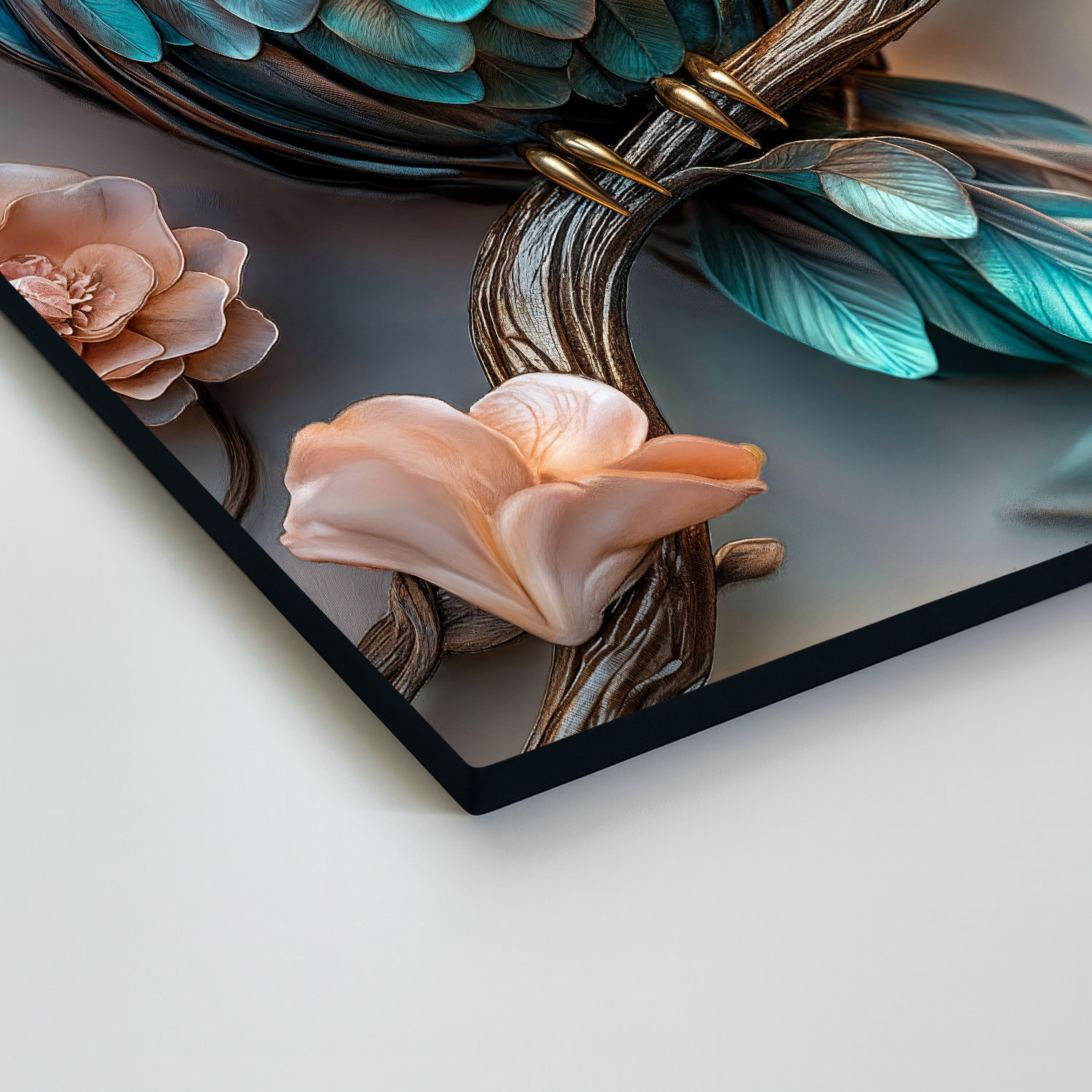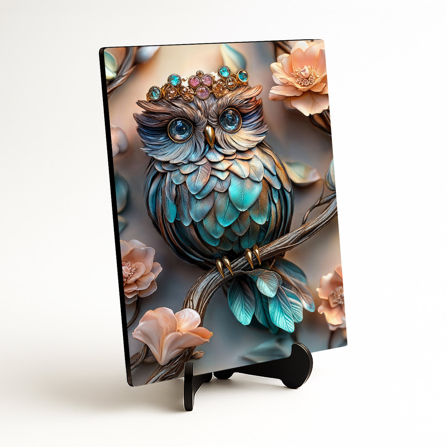 Drevený obraz zachytáva očarujúcu sovu s detailne vykresleným perím v tyrkysových a medených farbách, sediacu na rozkvitnutej vetve. Výrazným prvkom sú jej veľké modré oči a ozdobná korunka s farebnými drahokamami. Vďaka sýtym farbám a rozprávkovému motívu je obraz ideálny ako umelecká dekorácia do detských izieb, spální alebo kreatívnych kancelárií.