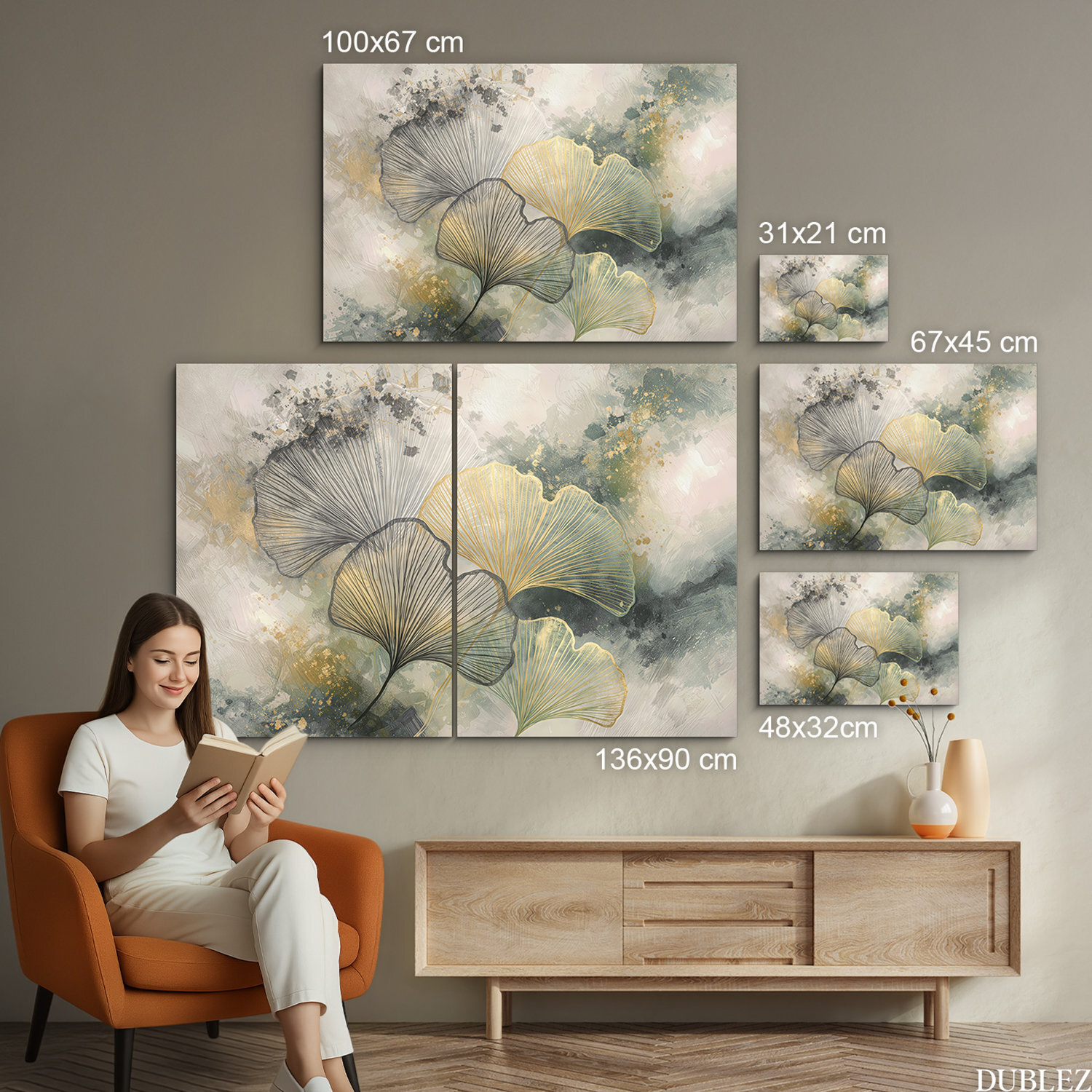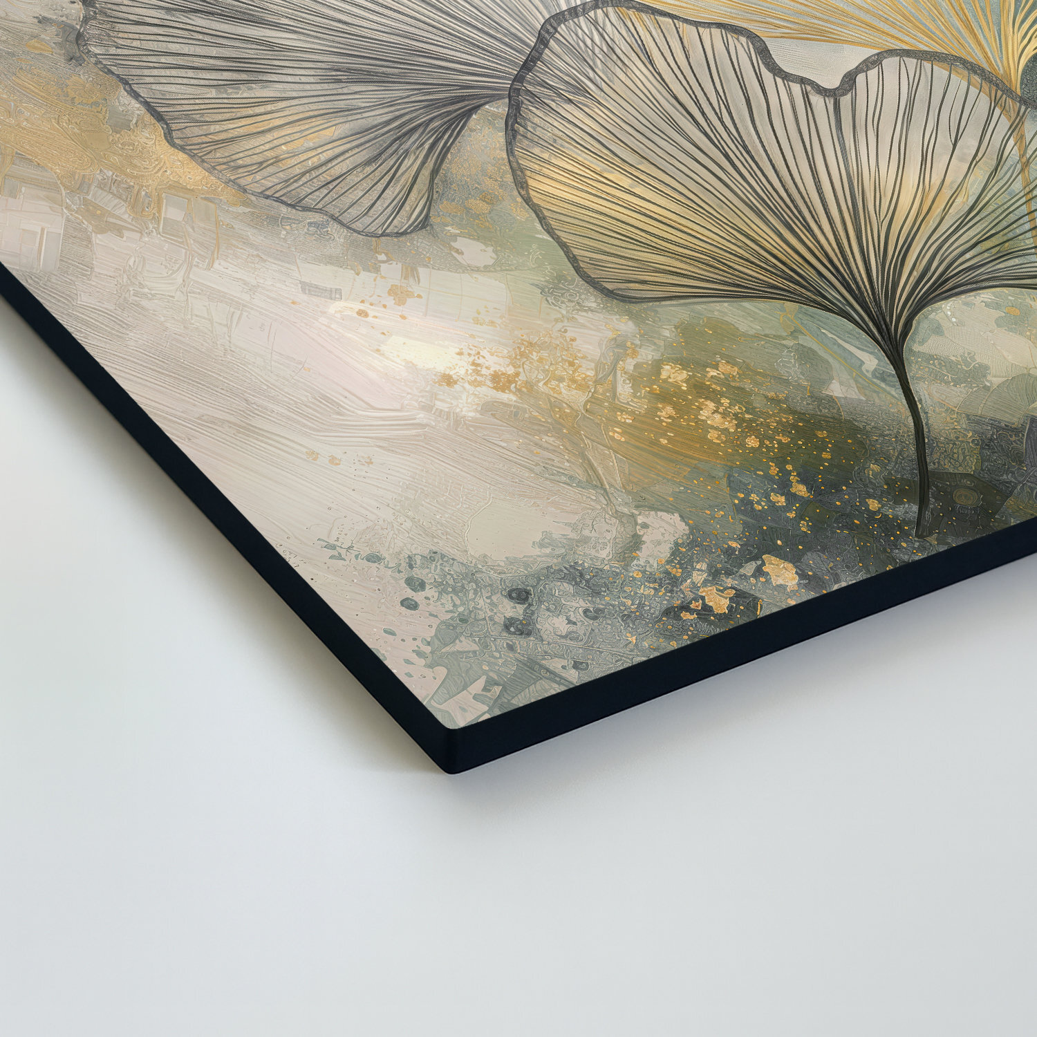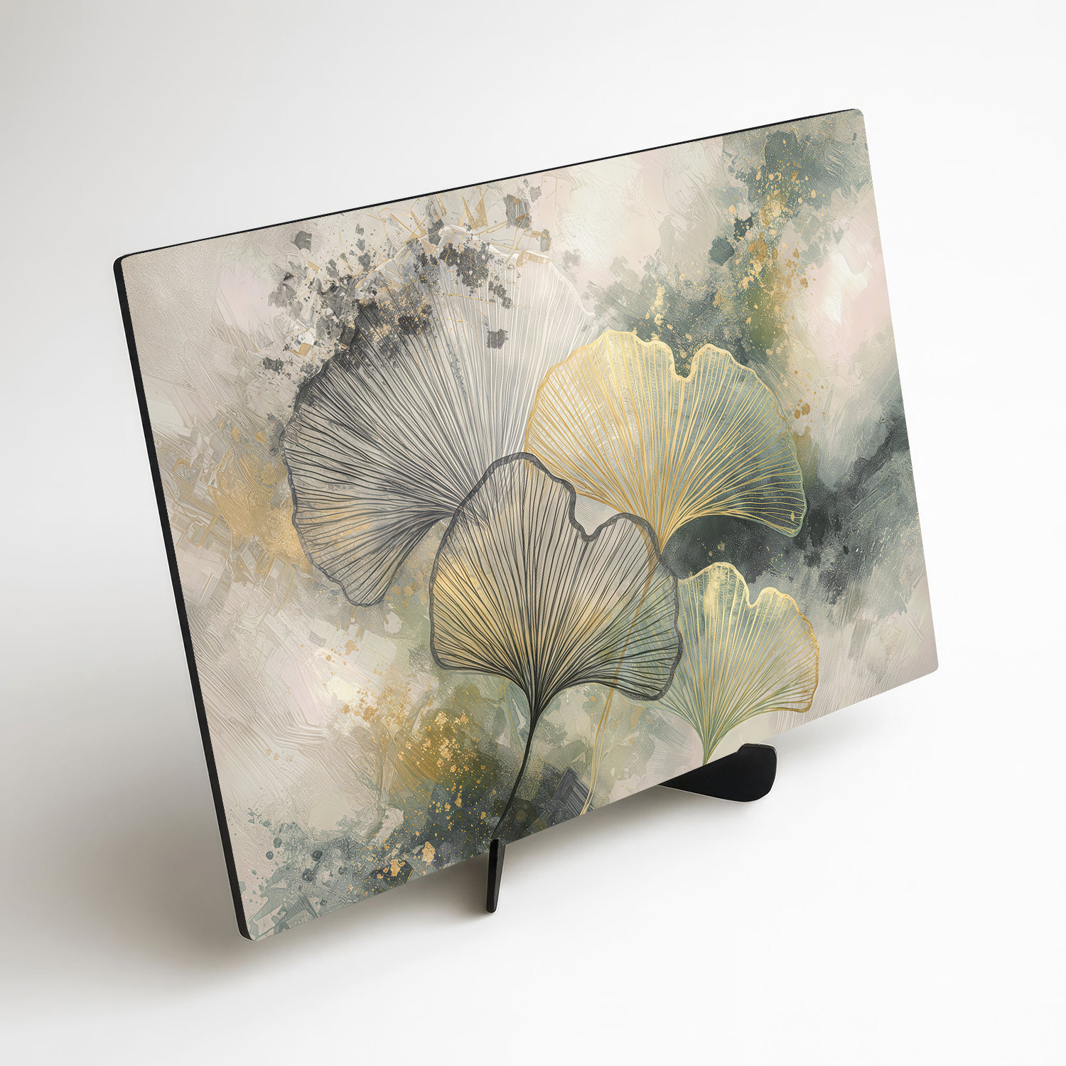 Veľký obraz ginkgo zobrazuje bohatú skupinu listov v zlatom prevedení. Detailná čierna kresba listov ostro kontrastuje s akvarelovým pozadím v zemitých a sivých farbách. Nástenný obraz ginkgo na dreve je navrhnutý pre priestranné steny nad sedaciu súpravu.