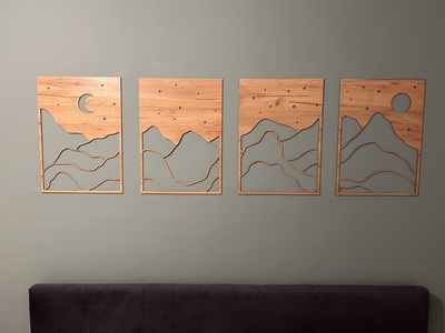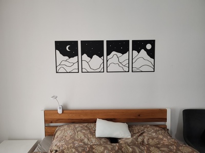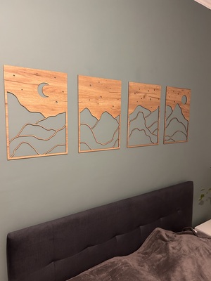 Viacdielny obraz Tajomstvá nočnej oblohy je originálna drevená dekorácia na stenu. Na pozadí obrazu môžeme nájsť hviezdy, mesiac a prepracované pohorie. Výrobok spája prírodu, moderný dizajn a štýlové prevedenie. Viacdielna dekorácia je vhodná do obývačky, alebo spálne, kde sa stane ústredným bytovým doplnkom.