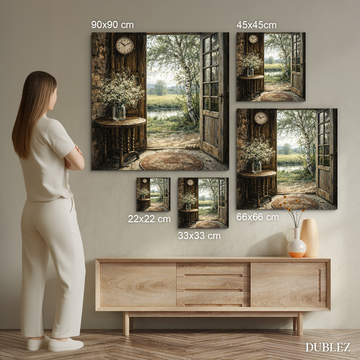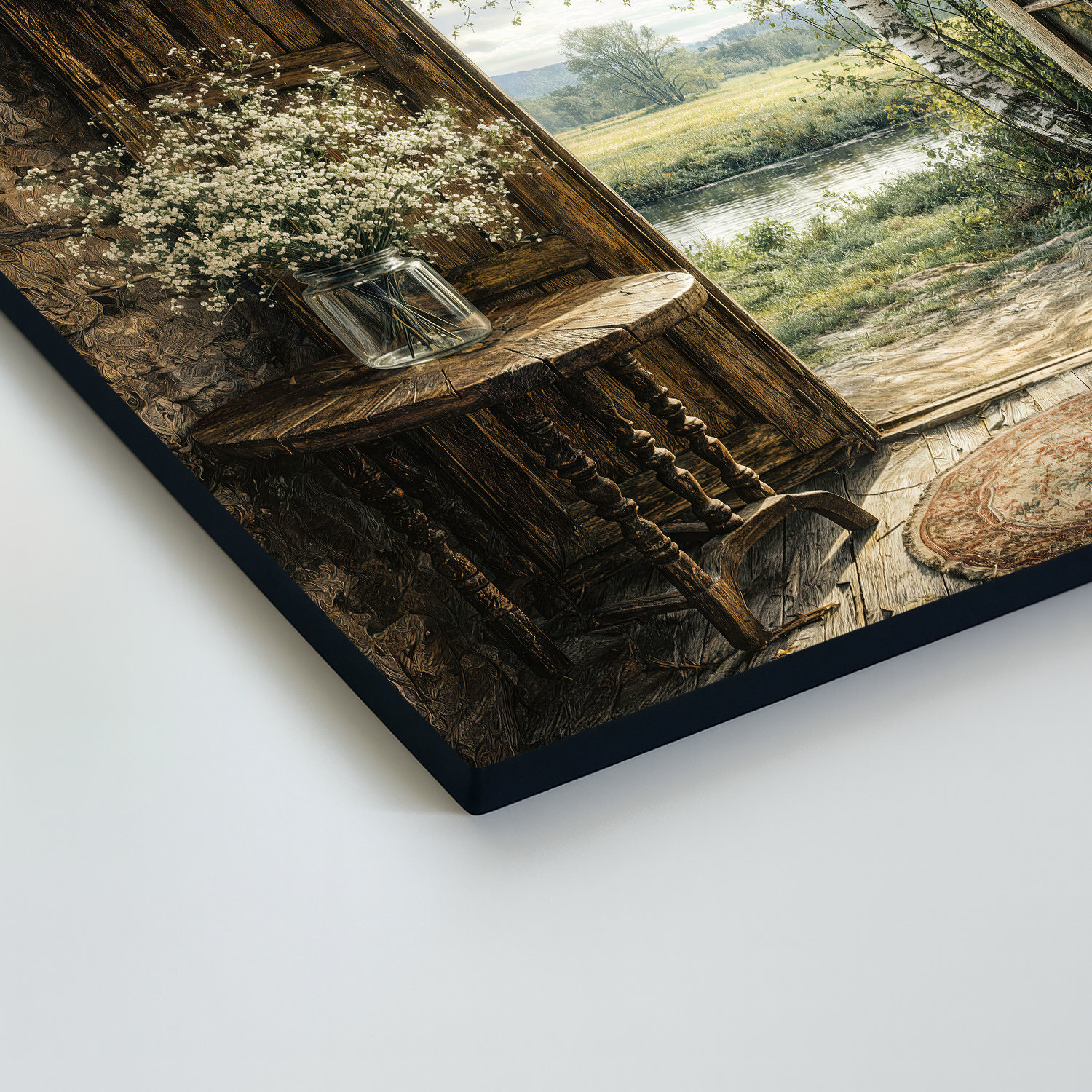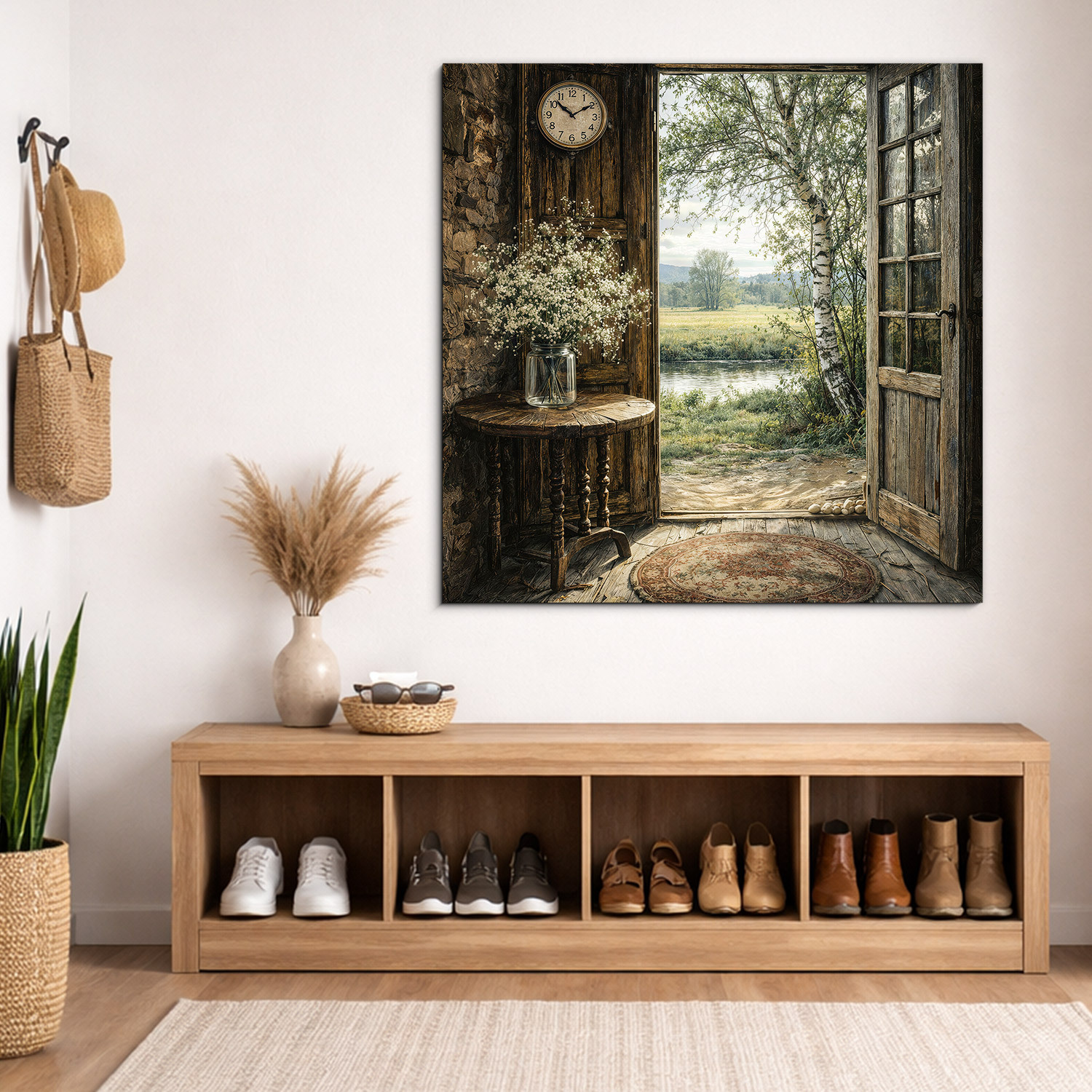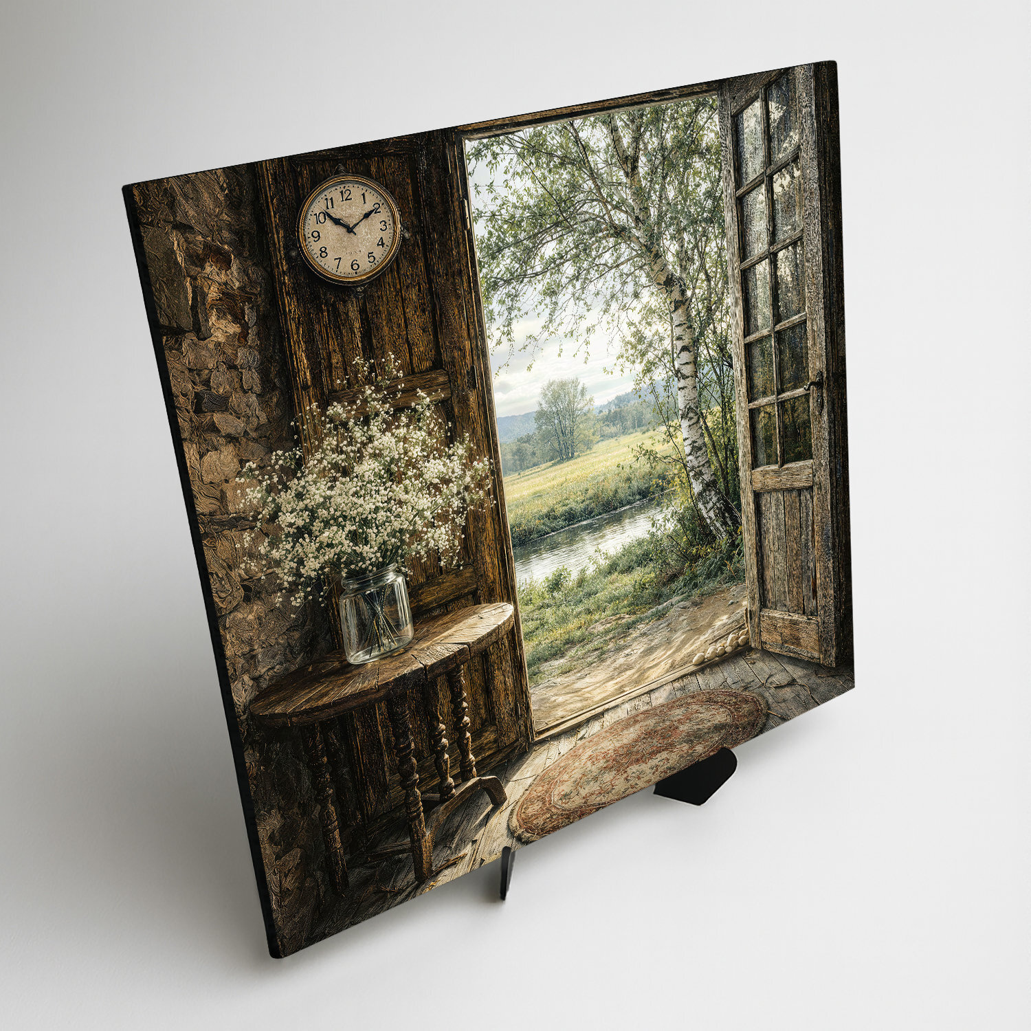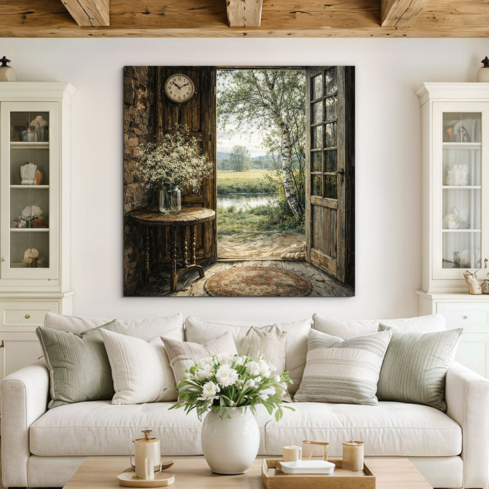 Vidiecky obraz s otvorenými drevenými dverami a výhľadom do pokojnej prírody v sebe spája teplo domova, jemnosť jari a nerušenú atmosféru vidieka. Rustikálne detaily, staré drevené hodiny a čerstvé lúčne kvety vnesú do vášho interiéru vôňu prírody a pocit bezpečia. Drevený obraz krásne vynikne v obývačke, spálni, na chalupe aj v útulnej predsieni.