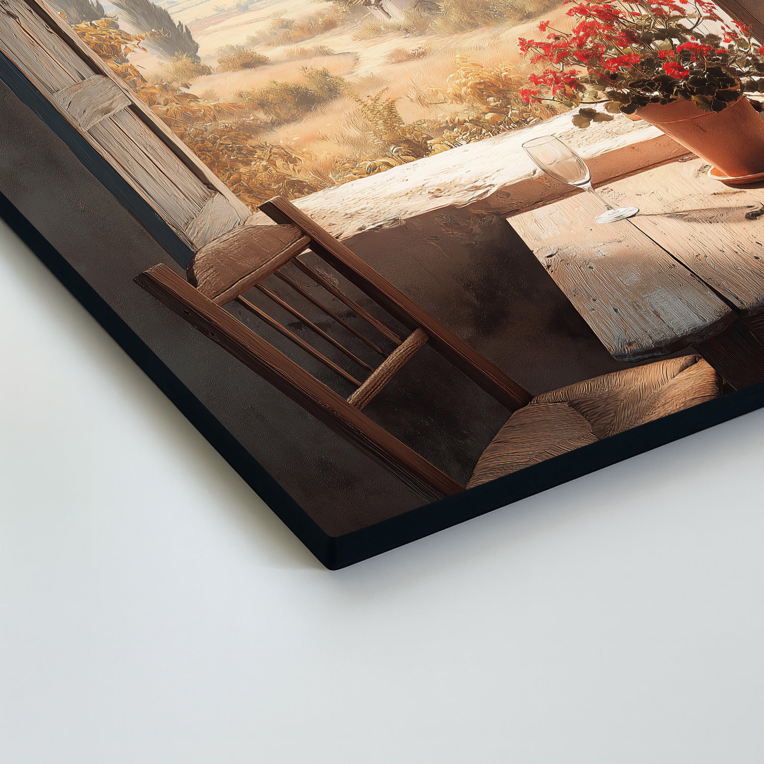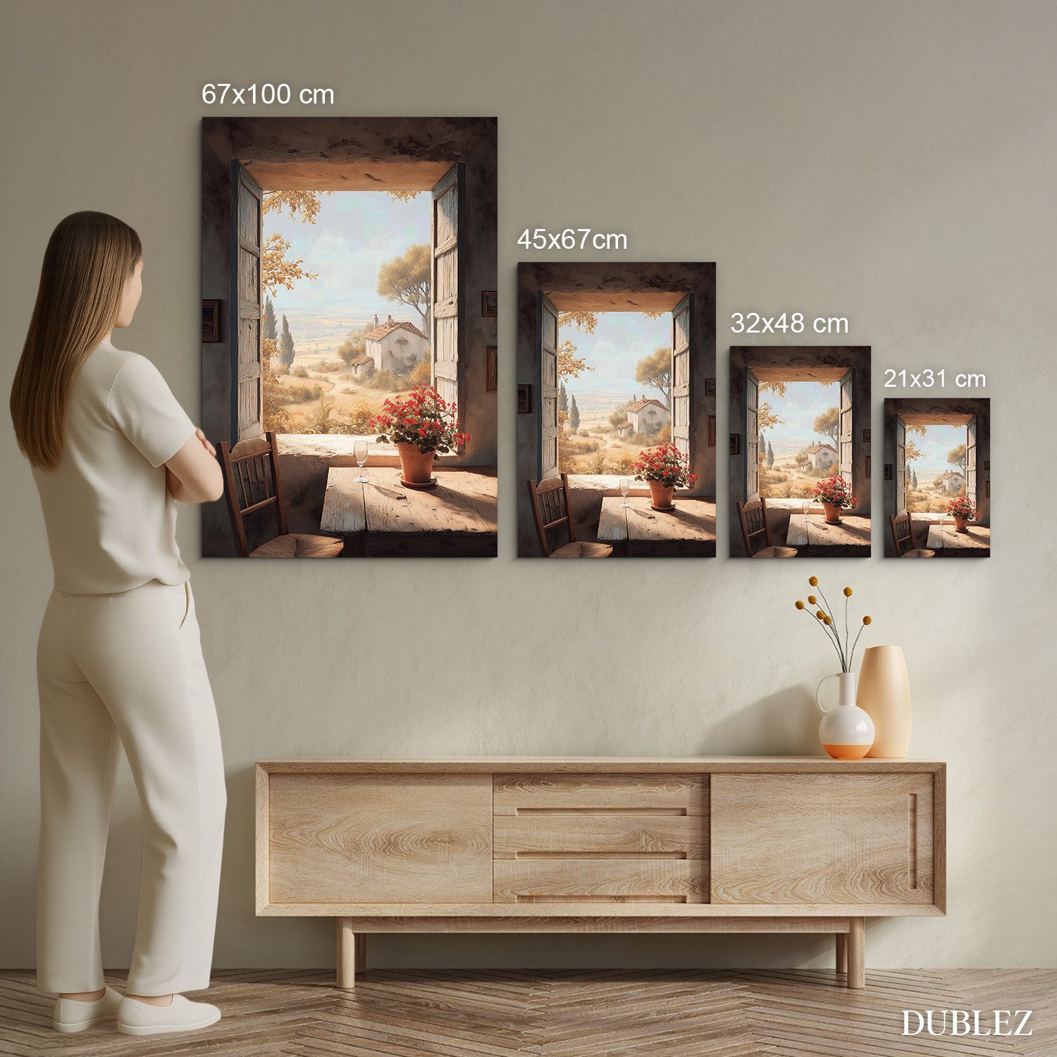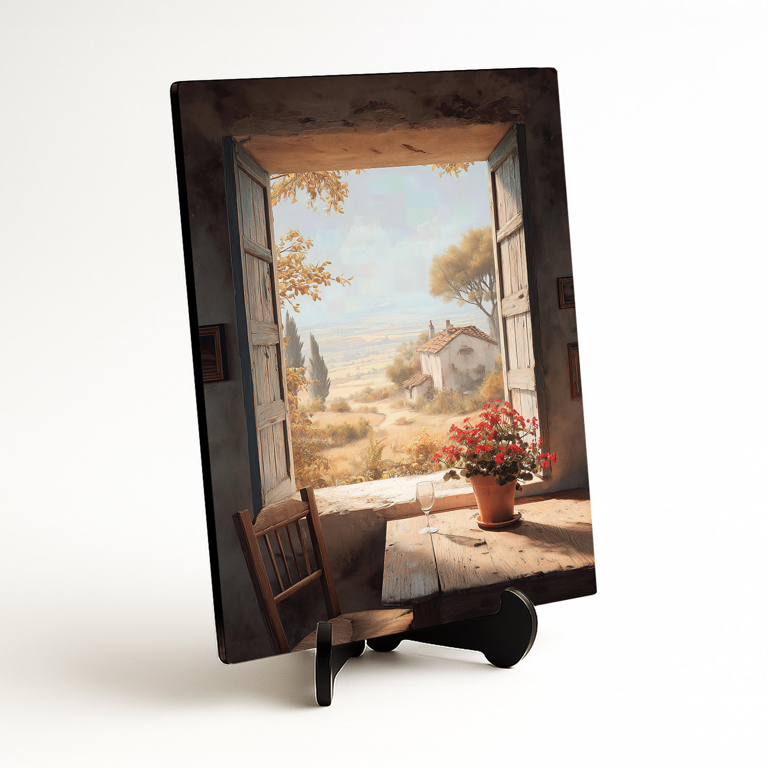 Drevený vintage obraz s výhľadom na toskánsku krajinu cez otvorené okenice prináša do interiéru pocit pokoja, domácej pohody a slnkom zaliateho vidieka. Vďaka teplým zemitým farbám a rustikálnemu motívu sa skvele hodí do vidieckeho, boho alebo vintage štýlu. Vintage obraz pôsobí ako otvorené okno do prírody a je ideálny do obývačky, jedálne či chalupy, kde vytvára únik od každodenného zhonu.