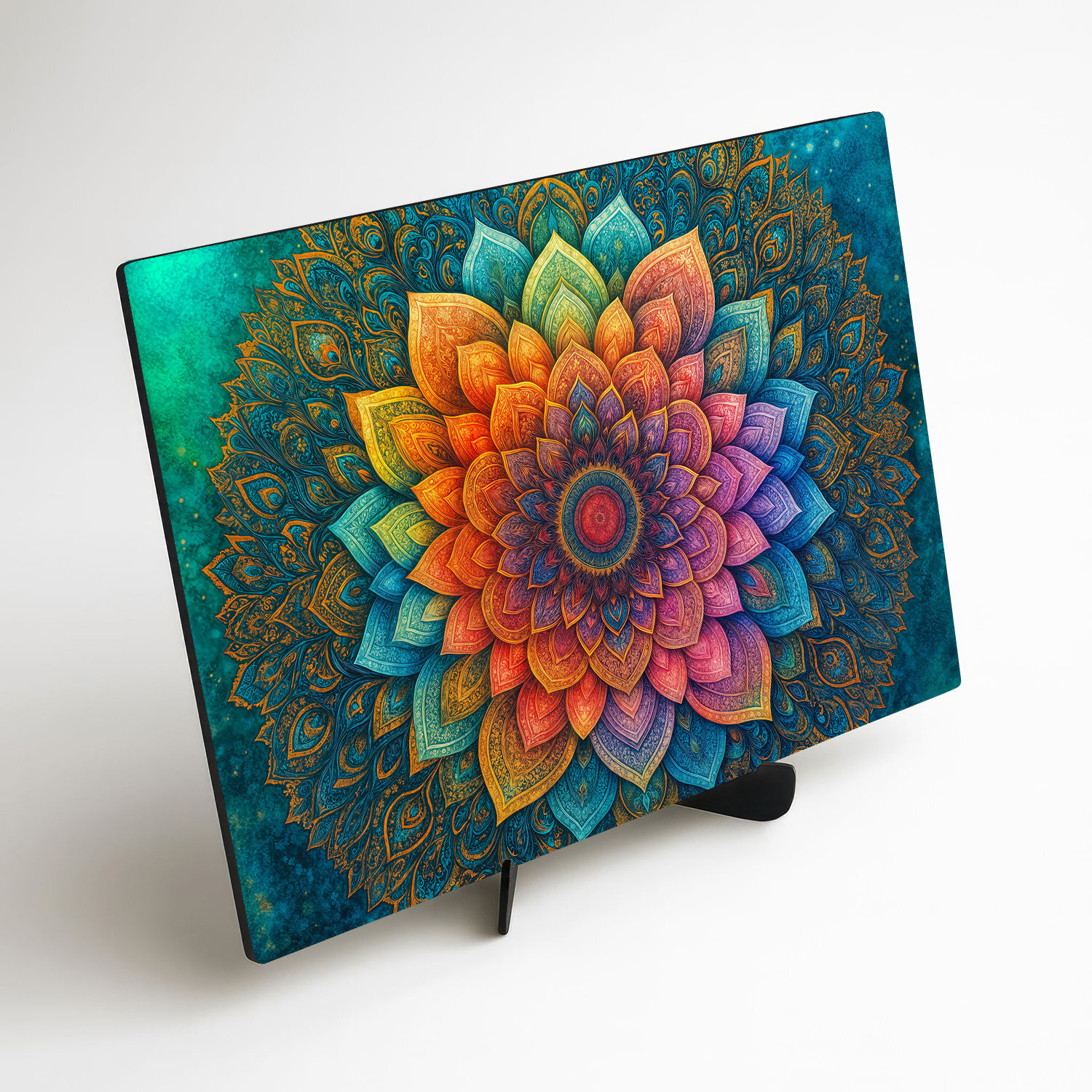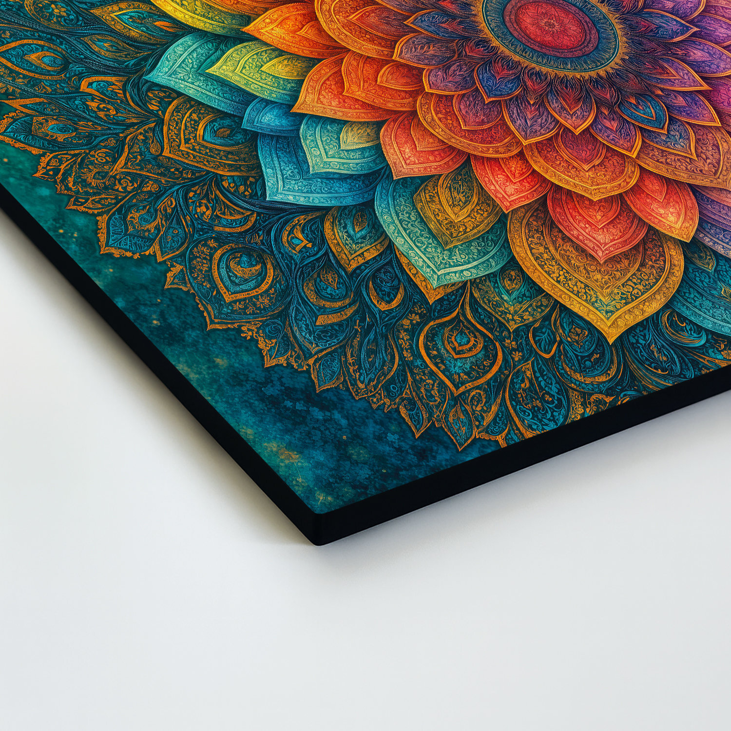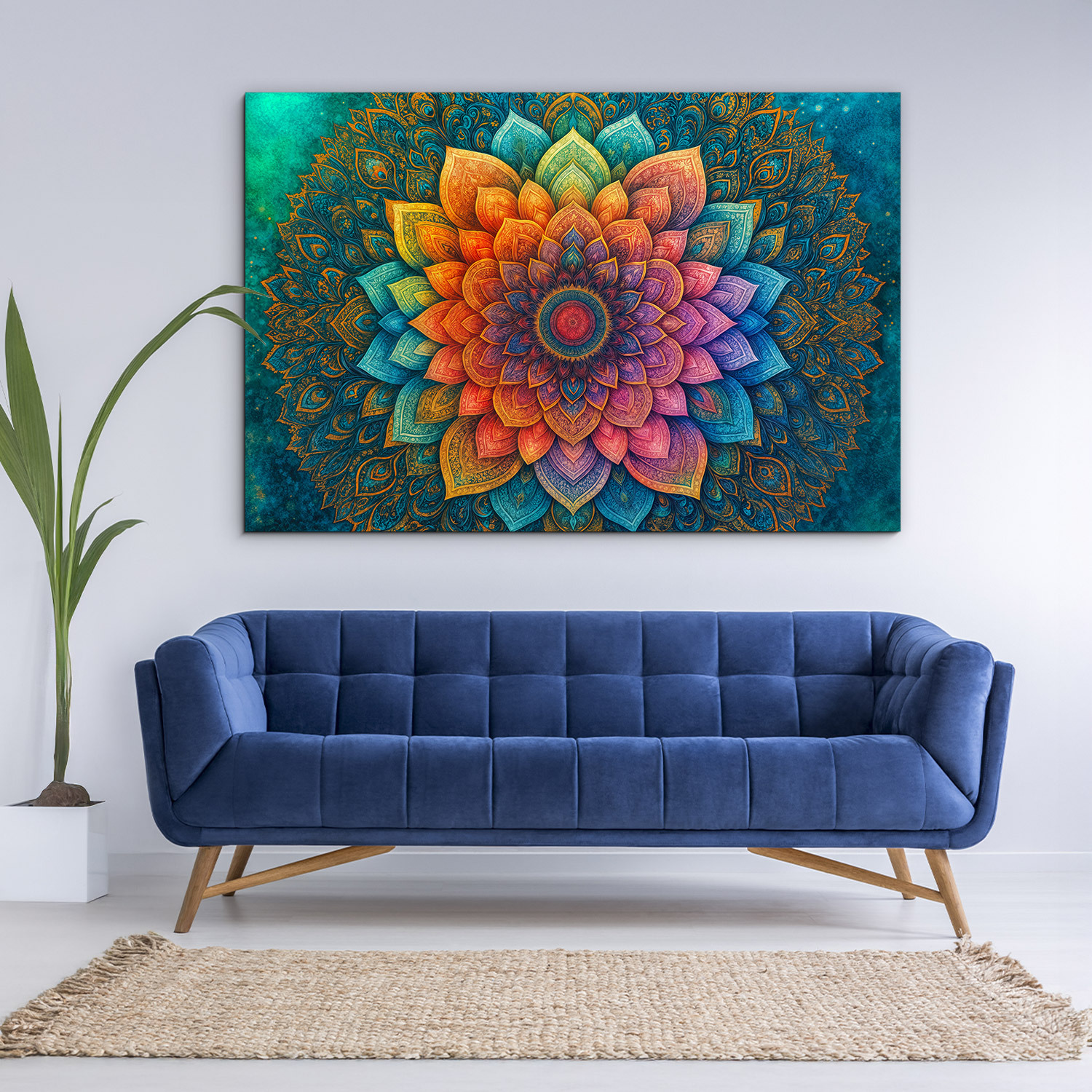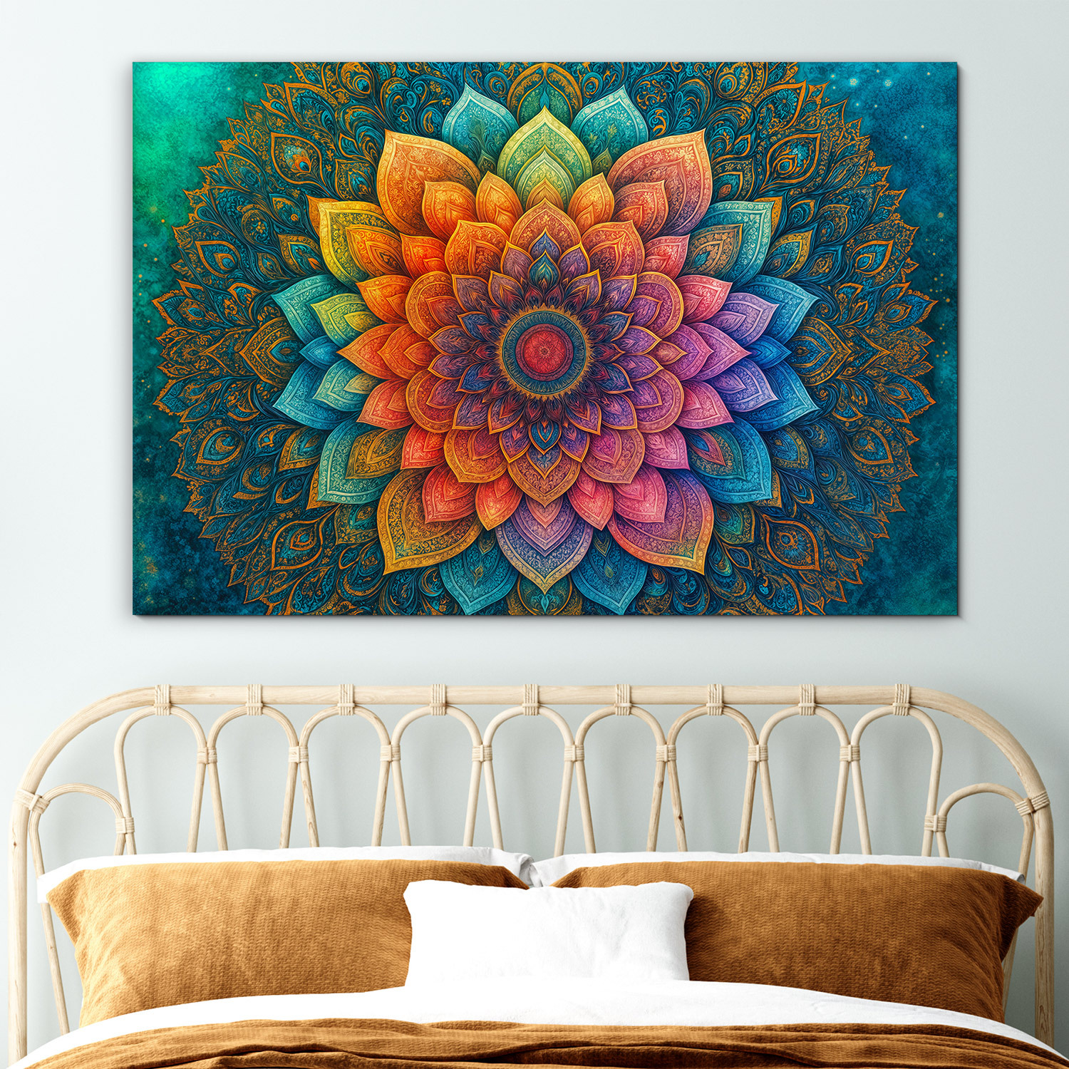 Význam obrazu: Žiarivá mandala napĺňa priestor svetlom a farbami, prináša pocit radosti a mení domov na miesto plné pozitívnej atmosféry.